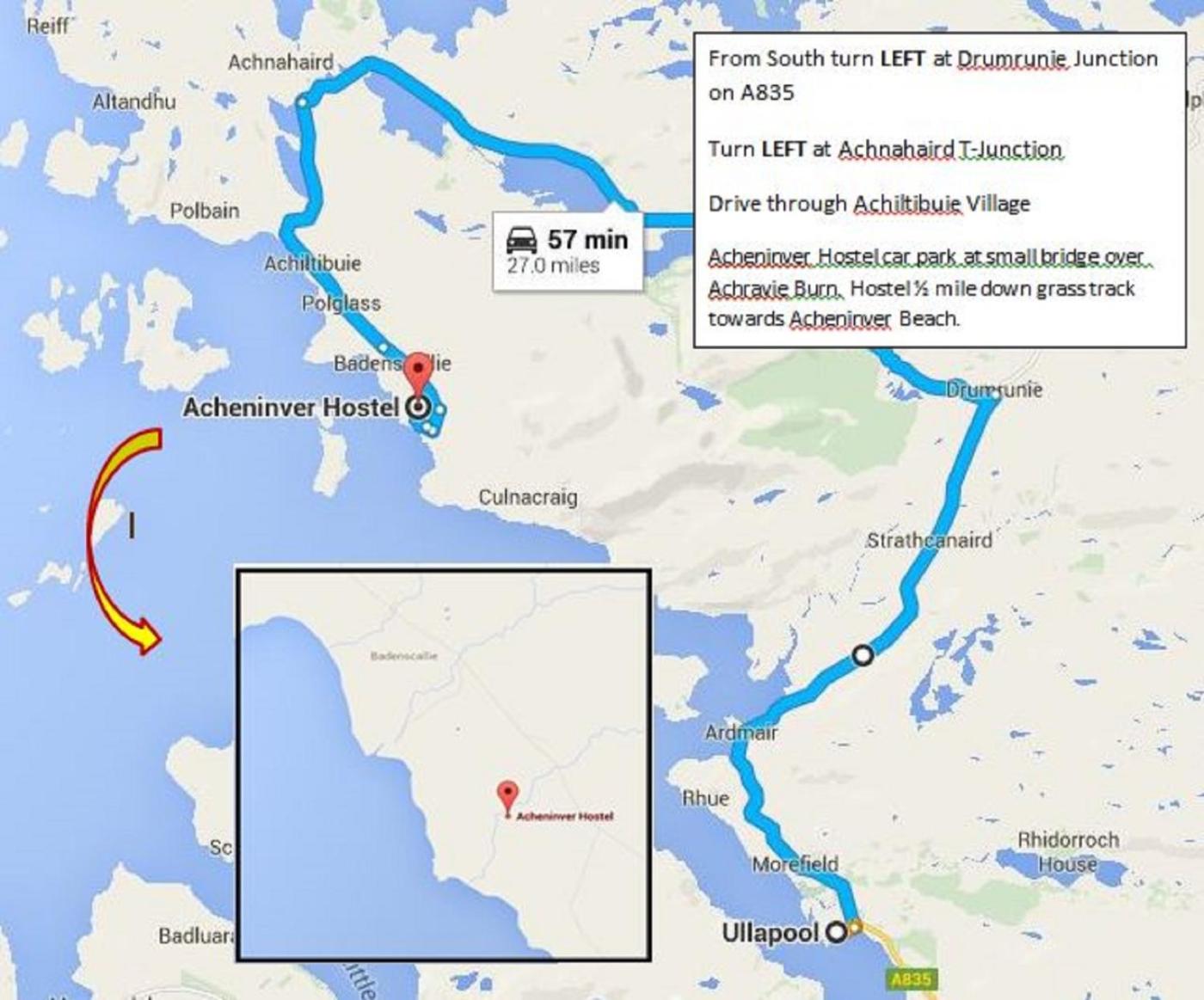 You can check in after 4pm on arrival day, check out is by 10am. Acheninver Hostel is 27miles from Ullapool and will take 1hour to drive.