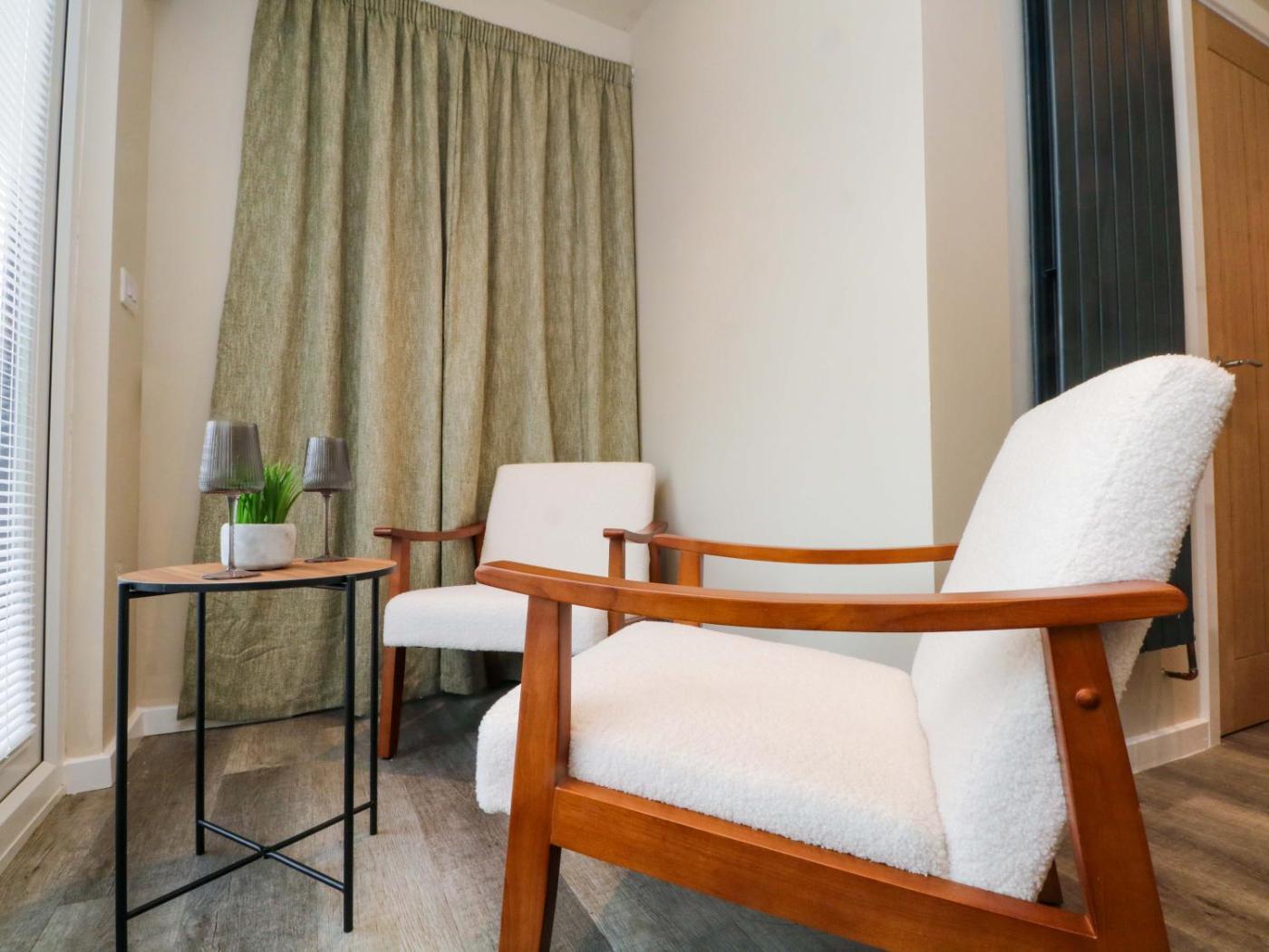 This holiday home has 1 bedroom, a kitchen with microwave, a TV, a seating area and 1 bathroom with a walk-in shower.