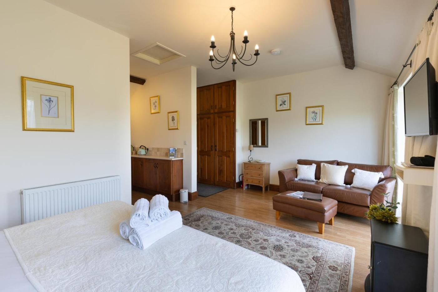 Deluxe King Room. There is a flat-screen Freeview TV with a DVD player, a seating area and teacoffee making facilities. Featuring a walk-in shower, the en-suite bathroom also comes with complimentary toiletries and a hairdryer. There are French doors leading onto a terrace with views over the fields. ;