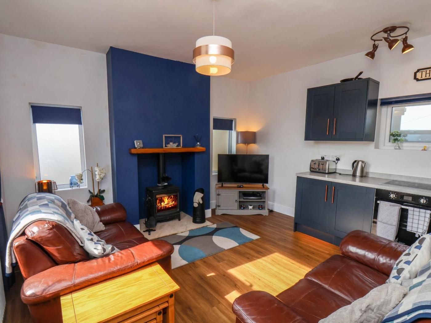 Holiday Home. The fireplace is the standout feature of this holiday home. This holiday home features 2 bedrooms, a seating area with a sofa and 1 bathroom with a walk-in shower. In the kitchen, guests will find a stovetop, a refrigerator, an oven and a toaster. The holiday home features a dining area, a wardrobe, an electric kettle, heating and a TV. The unit has 2 beds.